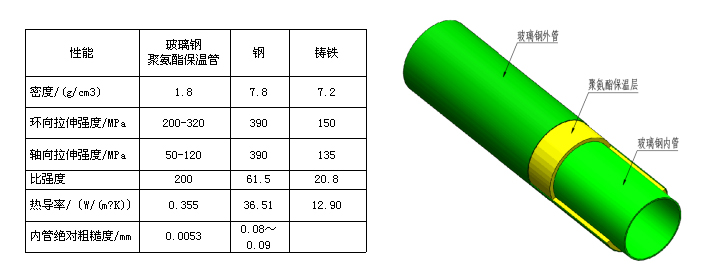 采用国内首创的新工艺生产的“连鑫”牌玻璃钢聚氨酯保温管,完全避免了以往长期存在的聚氨酯发泡不均匀以及内管偏心等情况,大大提高了保温管的整体性能。 性能特点: 热损耗低、保温性能好,比其它保温管材提高4倍以上 良好的防水和耐腐蚀能力 不结垢,对输送介质无二次污染 施工简便迅速,占地少,可直接埋入地下 管网维修费用少,综合造价低 使用寿命长,可达30年以上 产品规格: 直径:DN25~DN1000 压力等级:0.6~2.5MPa 介质温度:50~100℃ 执行标准: JC/T552-2016 纤维缠绕热固性树脂压力管 参照标准(部分参照) CJ/T129-2000 玻璃纤维增强塑料外护层聚氨酯泡沫塑料预制直埋保温管(钢内管) CJ/T114-2000高密度聚乙烯外护管聚氨酯泡沫塑料预制直埋保温管(钢内管) 应用领域: 地热(温泉)水输送 蒸汽凝结水输送 供热循环水输送 油田地热流体输送 机场空调新风系统