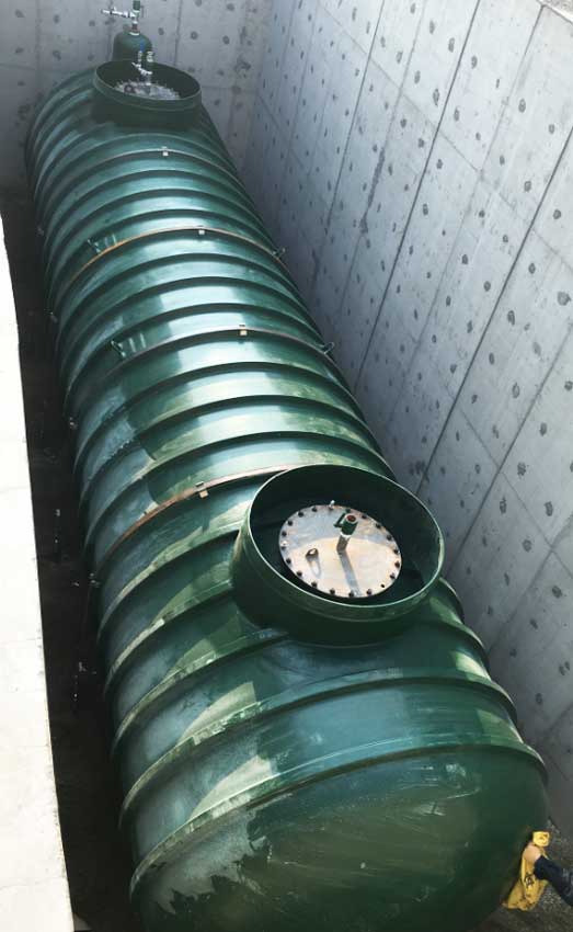 The tank is used underground for storage of fuel stations with a superior product life cycle over steel. The tank has a uniform sandwich space with reinforced ribs. The internal and external walls are FRP material, the between space have 3D structure. There is a leak detector and continuous interstitial monitoring system in the tank.