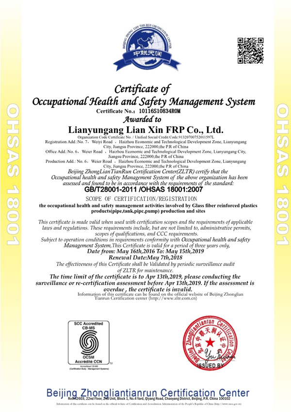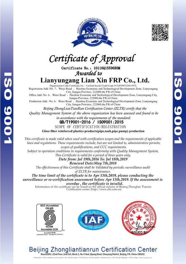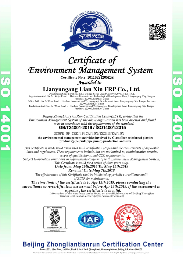 Lianyungang Lianxin FRP Co., Ltd., founded in 2003, which locates in the beautiful city of Lianyungang — the east bridgehead of Euro-Asia Continental Bridge. The company (two production areas) covers a floor area of 120,000m2 with 30000m2 modern standard workshop on it. It supplies over 20,000 tons FRP products annually, whose annual revenue is over RMB200 million. Lianxin has more than 50 professional technicians, including 6 senior engineers and 22 junior engineers. It has also cooperated with many domestic universities and scientific research institutes in development in research & manufacture, technical consulting and project general contracting of FRP products. Core products of the Company include FRP pipe (pure FRP pipe, pipe with stiffening rings, mortar pipe, thermal insulation pipe, ventilating pipe, wear-resistant pipe), FRP fittings, FRP vessel (tank, Large FRP tank on site , double-wall oil tank), FRP equipment (biological odor control device, integrated pumping station, washing tower, inspection well, flue gas desulfurization device), chimney and flue, desulfurization tower, etc....【more】